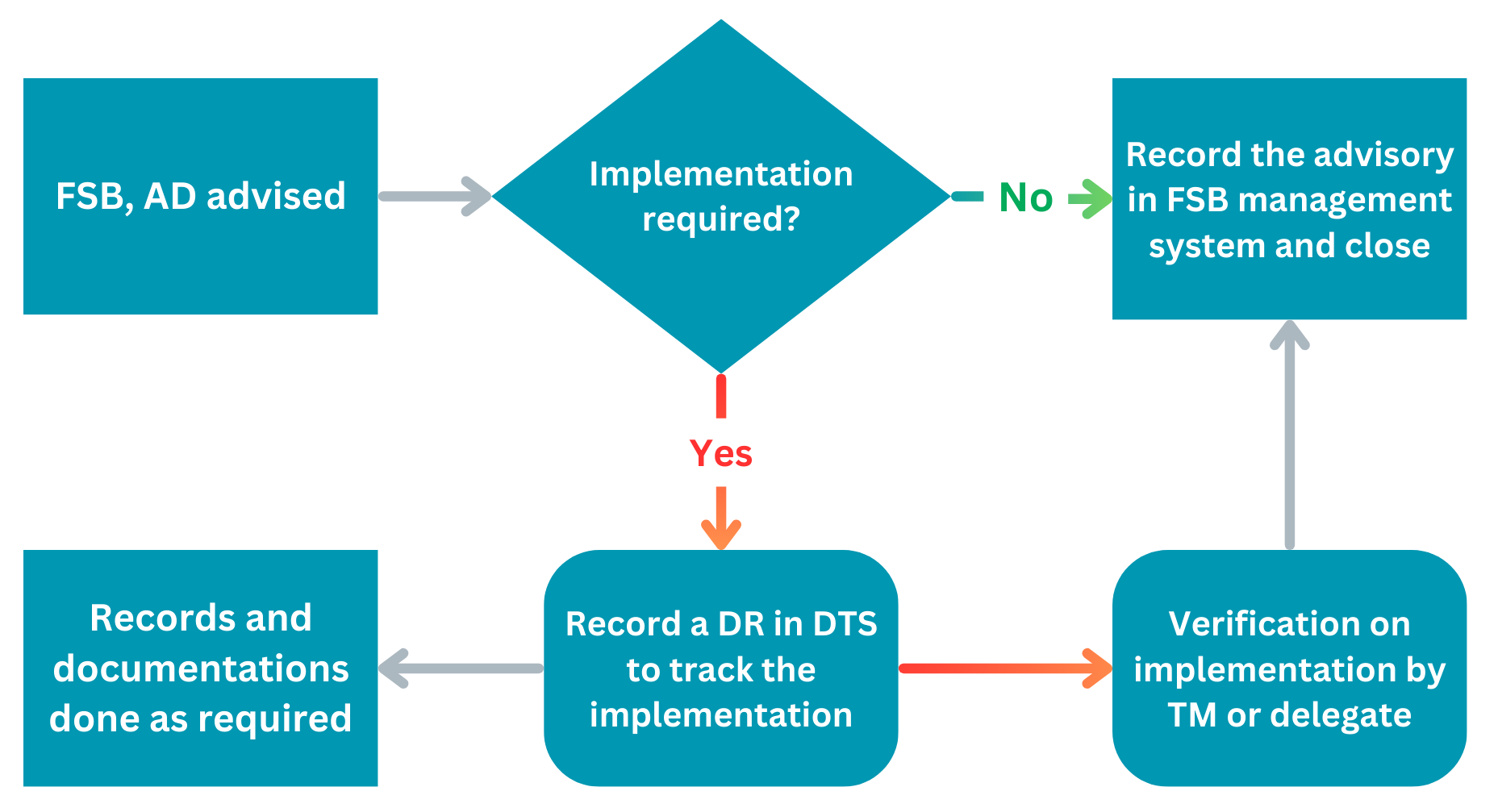 - Updates are notified to Technical Staff via email subscription to FSB or any other means advised by TDM. All regulatory authority AD is monitored by Compliance Team and notified to Technical Staff if applicable.